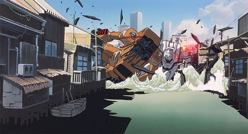 في Patlabor: The Movie (عام ١٩٨٩)، حيث يقوم العاملون (روبوتات مسيرة من الإنسان) تابعة للقسم ٢ من العربات الخاصة التابعة لشرطة مدينة طوكيو، بمحاولة فرض النظام من جديد في طوكيو نهاية القرن. (© 1989 HEADGEAR/BANDAI VISUAL/TOHOKUSHINSHA)