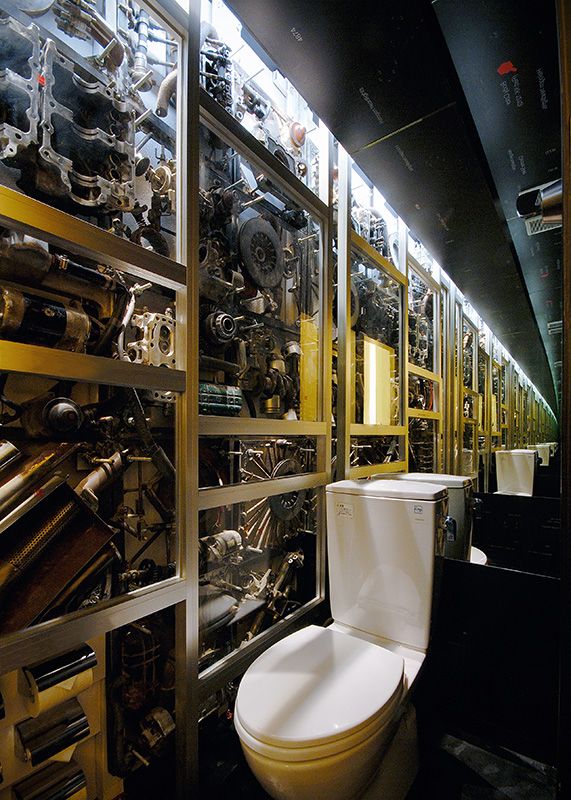 في ”مطعم الروبوت Robot Restaurant“ الموجود في كابوكيتشو بحي شينجوكو والمشهورة بألوانها الزاهية وبكونها مكاناً للفن الترفيهي، نجد الاهتمام بكل التفاصيل لا سيما تصميم المرحاض بهذا الشكل ليتوافق مع الفكرة والجو العام.