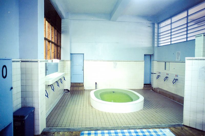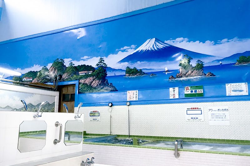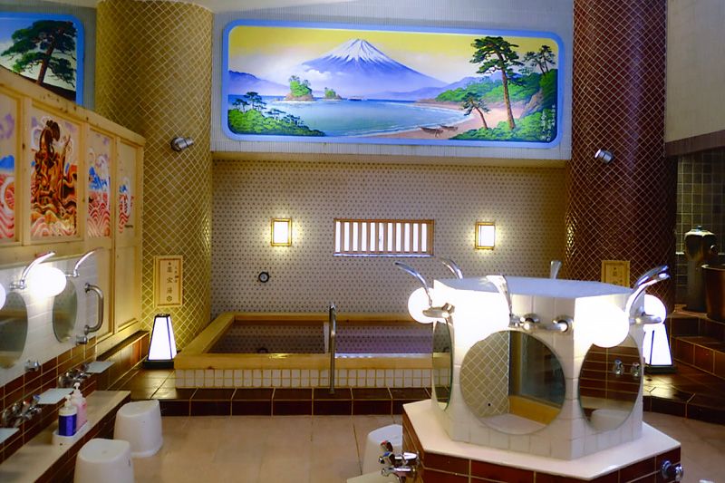 يجمع هذا الحمام العام بين طرز التصميم اليابانية والغربية ويتميّز باحتوائه على صورتين فريدتين لجبل فوجي.