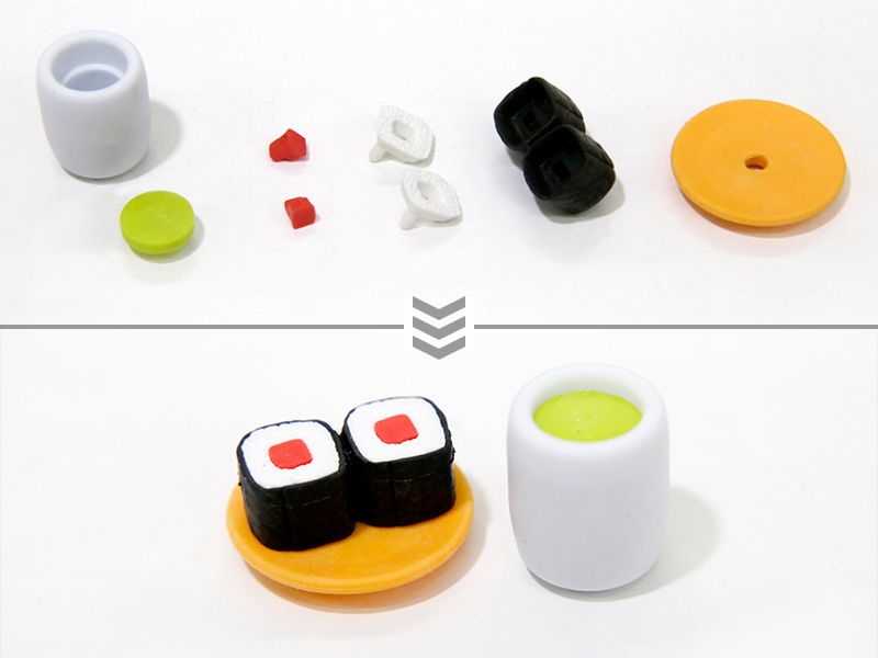 من أبرز جوانب المتعة في مماحي إيواكو هو إمكانية فكها وإعادة تركيبها. قد يبدو صنعها سهلاً للوهلة الأولى، ولكن عند النظر عن كثب نجد أنها مكونة من أجزاء متعددة تعتمد على التصميم. على سبيل المثال، الممحاة التي تأخذ شكل السوشي تتكون من قطع السمك، الأرز الأبيض، وورق السوشي، بينما تتكون الممحاة التي تأخذ شكل الطائرة من جسم الطائرة، الجناح الرئيسي، وذيلها. عادةً ما تتكون كل ممحاة من جزئين إلى أربعة أجزاء، مما يضيف لمسة من التعقيد والإبداع إلى هذه القطع الصغيرة.