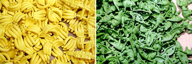 هناك العديد من الأجزاء متنوعة الألوان تم صنعها في المصنع. الموز على اليسار والديناصورات على اليمين.