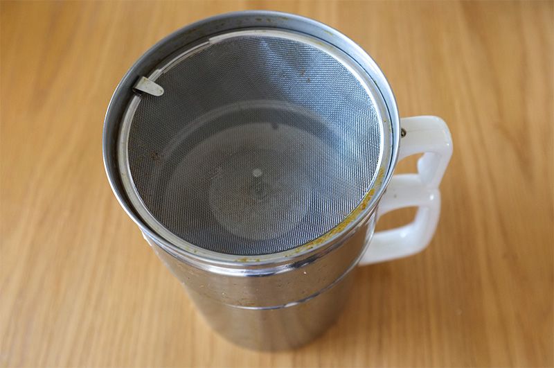 إن وجود وعاء للزيت مثل الذي في الصورة يسهل عملية تصفية وتخزين الزيت. يمكن إعادة استخدام الزيت لثلاث أو أربع مرات (Nippon.com).
