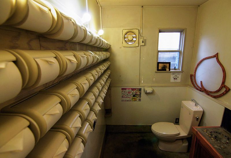 من الأشياء الملاحظ رؤيتها بشكل متكرر في اليابان ورق المرحاض مع طيات مثلثة الشكل في نهاية أطرافه كما هو الحال في دورة مياه الحانة المبينة في الصورة أعلاه.
