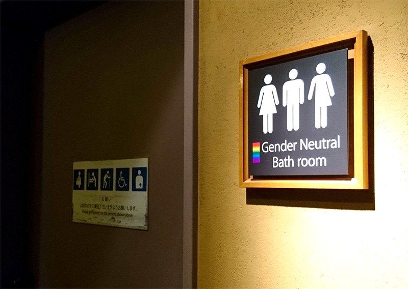 وهناك أيضًا اتجاه لتقديم مراحيض محايدة فيما يتعلق بنوع الجنس وهي مراحيض يمكن لأي أحد استخدامها بغض النظر عن جنسه. في مكتب بلدية شيبويا في طوكيو، وهي إحدى أولى البلديات التي بدأت في إصدار شهادات لتوثيق العلاقة بين شريكين من نفس الجنس، وهي شهادات تضمن لهم بعض الحقوق كتلك التي تضمنها شهادات الزواج، توجد لافتات تحمل ألوان قوس قزح تذكرنا بالعلم متعدد الألوان لحركة LGBT. كما أن اللافتات الجديدة الخاصة بالمراحيض المحايدة فيما يتعلق بنوع الجنس والتي تصور رسماً يرتدي سروالاً على جانب وتنورة على الجانب الآخر يمكن رؤيتها في أماكن مثل متجر التخفيضات Mega Don Quijote في شيبويا، بالإضافة إلى الفنادق في كيوتو التي تستقبل أعداداً متزايدة من السياح الأجانب.