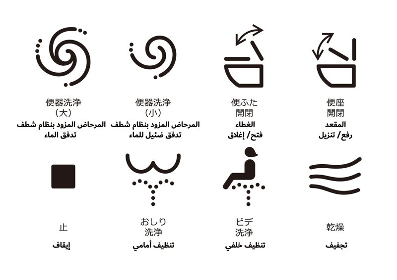 ومن بين المشاهد الأخرى الشائعة في اليابان ما يسمى بالمراحيض متعددة الأغراض المصممة لكي تستخدمها مجموعة كبيرة من الأشخاص، تشمل ذوي الاحتياجات الخاصة والوالدين برفقة أطفالهم الصغار، ورغم ازدياد أعدادها إلا أن لوحات التحكم المركّبة في المرحاض أصبحت أكثر تعقيداً. لقد رأيت العديد من أنواع المراحيض المختلفة في اليابان، ولكنني أجد صعوبة حتى الآن في معرفة مكان زر "تدفق الماء"! ولحسن الحظ، فإن جميع المراحيض المصنعة منذ عام 2017 تستخدم نفس الرموز في لوحة التحكم. أتمنى أن يتمكن ضيوفنا الدوليون من التعرف على هذه الرموز، وأن يشعروا براحة أكبر عند تجربة المراحيض المتطورة في اليابان.