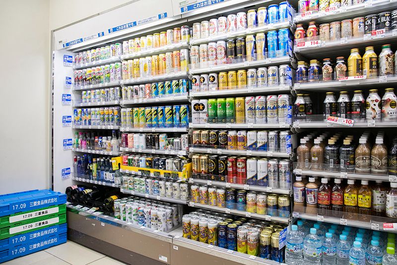 تقدم متاجر الكومبيني اليابانية مجموعة هائلة من المشروبات الكحولية، تشمل منتجات البيرة المتعددة التابعة للعلامات التجارية الشعيرة، والويسكي المعبأ في عبوات معدنية، والساكي، والمشروبات الكحولية المقطّرة.