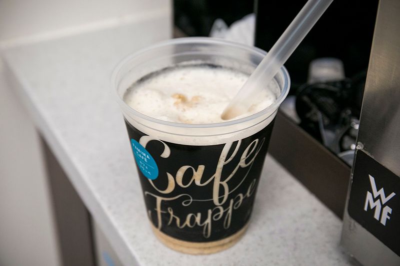 1.اشتر كوب يحمل العلامة التجارية من طاولة الصراف. الأكواب المعبئة بالثلج من أجل القهوة المثلجة توجد محفوظة في ثلاجات المتجر.