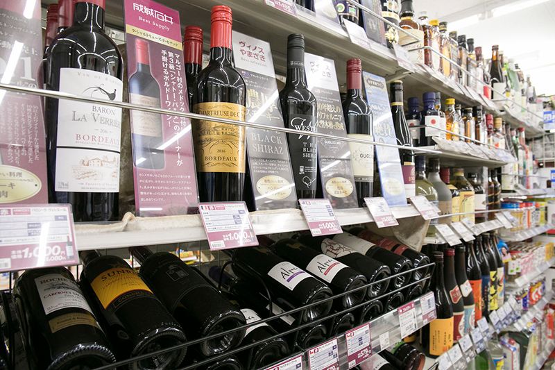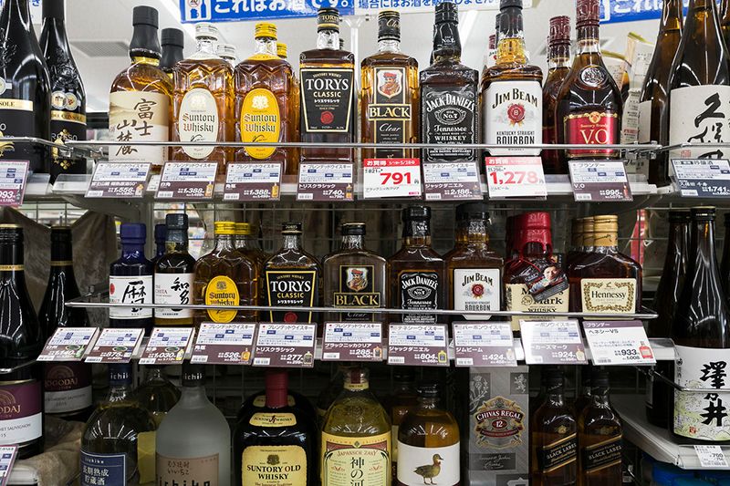 تعرض المتاجر المشروبات الروحية من العلامات التجارية اليابانية والأجنبية على حد سواء.