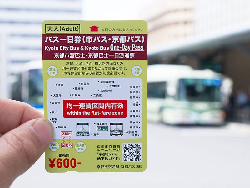 ننصحك بشكل خاص بشراء بطاقة ركوب حافلات لمدة يوم واحد والتي تبلغ قيمتها 600 ين (300 ين للأطفال) والتي يمكن استخدامها في كل من خطوط حافلات مدينة كيوتو وشركة حافلات كيوتو. إن قيمة بطاقة الركوب العادية لمرة واحدة في الحافلة ثابتة وتبلغ 230 ينا (120 ينا للأطفال)، فإذا قمت باستخدام بطاقة الركوب لمدة يوم واحد لثلاث مرات أو أكثر، تكون قد وفرت بعض النقود. ومع ذلك، لاحظ أن بعض الوجهات ستكلفك مبالغ إضافية قليلة. انظر القوائم أدناه.