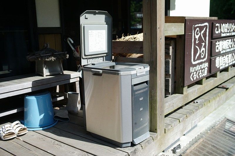 آلة معالجة نفايات الطعام الصادرة من المنازل. يتم استخدام نشارة خشب الأرز الياباني الموجود في المنطقة من أجل تكاثر الكائنات الحية الدقيقة التي تقوم بتفكيك نفايات الطعام.