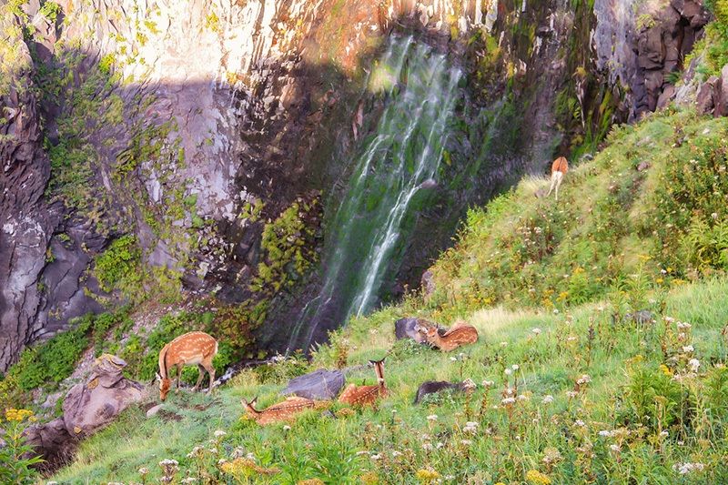 أمام الزوار فرصة جيدة لرؤية غزلان هوكايدو بالقرب من شلال فوريبي. (الصورة مقدمة من جمعية السياحة في شيريتوكو شاريتشو).