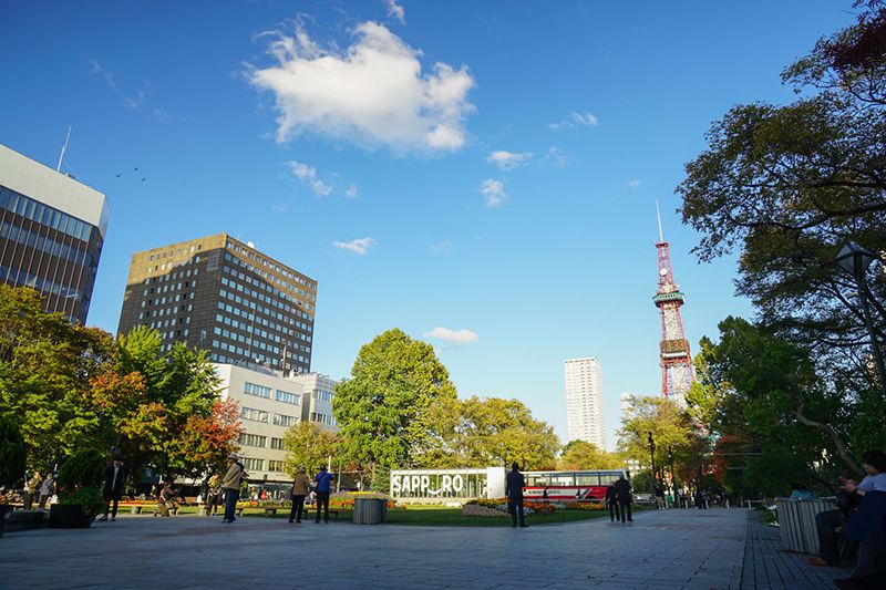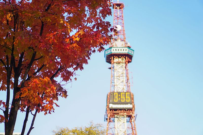 إلى الشرق من متنزه أودوري يوجد برج التلفزيون في سابورو وبجانبه تشاهد أوراق الخريف.