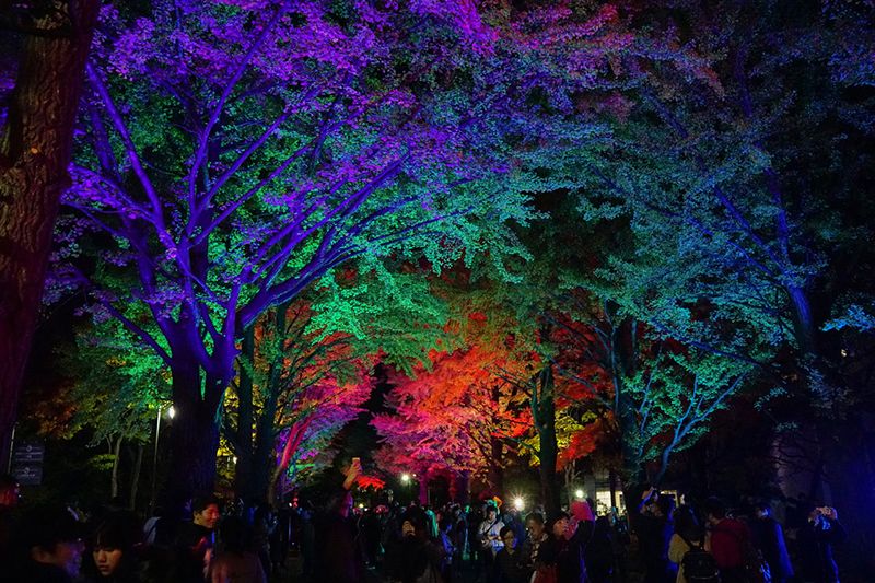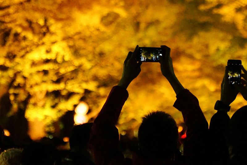 أول عرض على الإطلاق للإضاءة باستخدام نطاق كامل من الألوان. يحبس الزوار أنفاسهم عند رؤية التوهج الرائع لأوراق الجنكة.