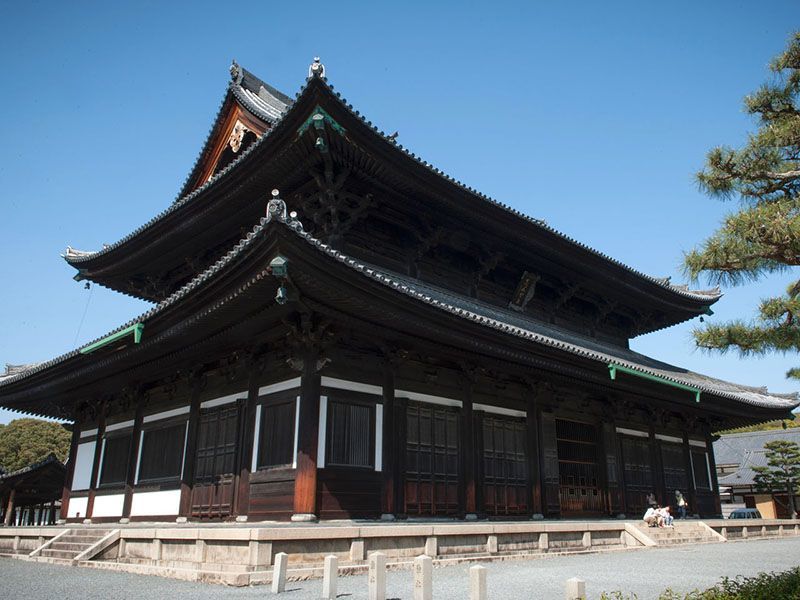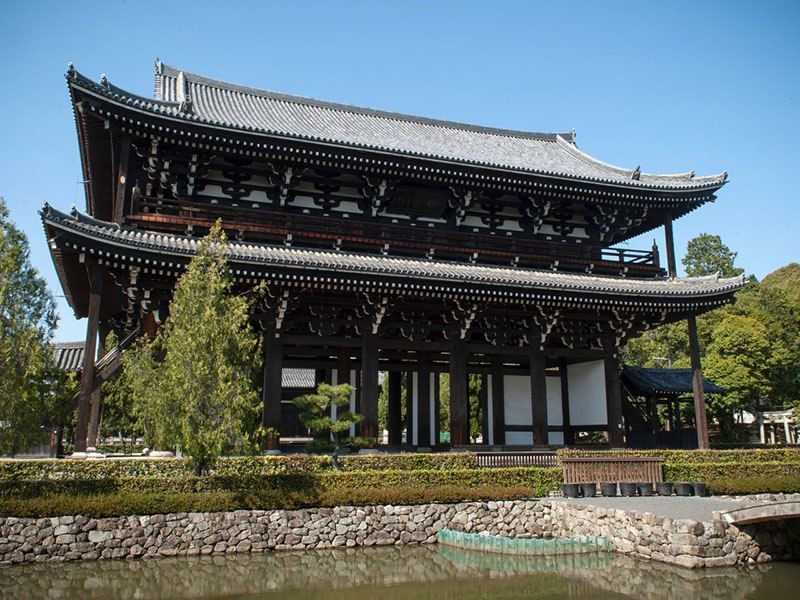 صورة لهوندو ’’المبنى الرئيسي‘‘ الخشبي في معبد توفوكوجي، بواجهة عرضها 41.4 متر، وقد تمت إعادة بنائه في القرن العشرين. وإلى اليسار مدخل جسر تسوتينكيو.