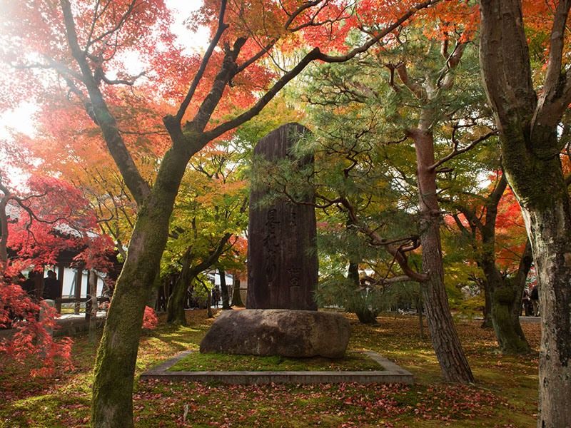 أوراق الخريف تحيط بالنصب التذكاري المنقوش عليه قصيدة، تُنسب إلى الراهب المشهور كوكاي، وترجمتها التقريبية تعني ’’عندما آتي إلى تسوتين، أرى القمر اللامع وأنا متسمر في مكاني‘‘.