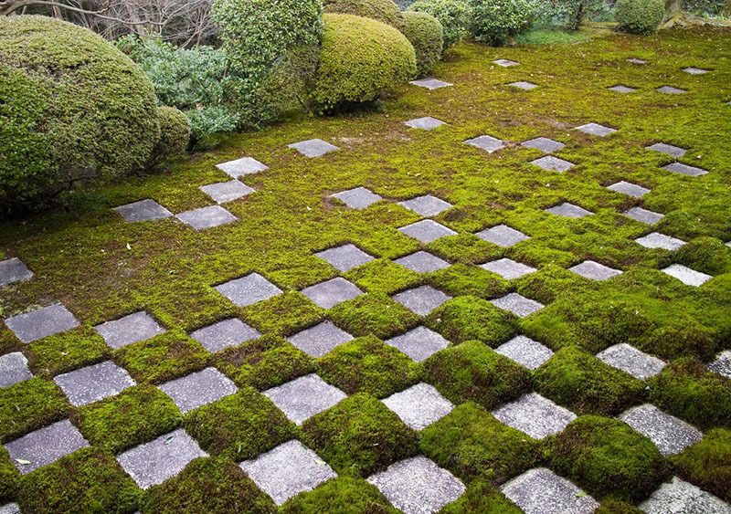في الحدائق الشمالية من هونبو، تتشابك الطحالب وقطع البلاط لتشكلان معا ما يشبه رقعة الشطرنج.