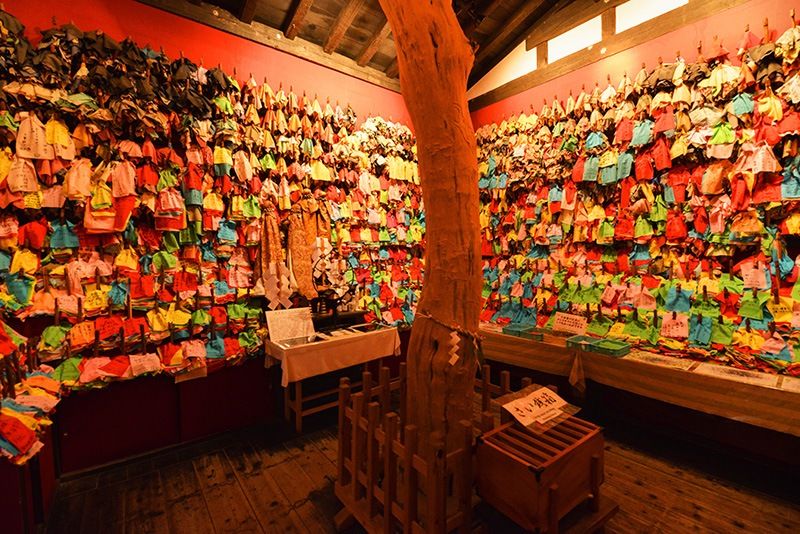 جدران حمراء تحيط بشجرة مقدسة (غوشينبوكو) وهي مزينة بالكامل بتماثيل لآلهة منزلية.