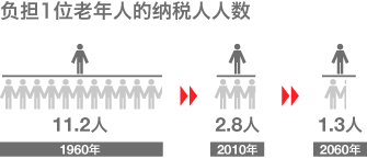 现在每1位65岁以上的老年人,由2.8位纳税人负担其养老金生活,40年后则必须由1.3人来支撑1人。国家用于养老金、医疗、护理的国费支出为17.2万亿日元(2011财年)。但是,现在的税收缺口近6成的10万亿日元,依靠发行赤字国债填补。2020年度的不足部分将膨胀到16.3万亿日元。在国家的借债总额接近1000万亿日元,欧洲危机的阴影不期而至之时,大幅增税不可避免,这就是现状。