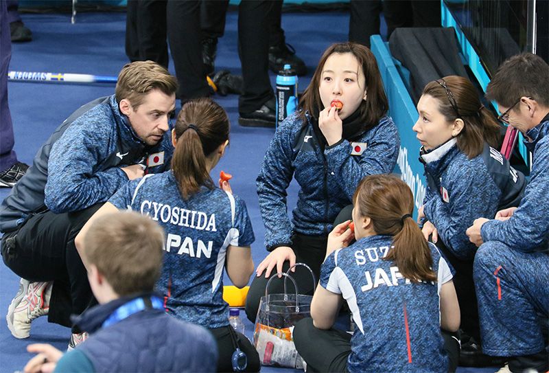 上图:女子冰壶第一轮,日本队对瑞典队。第五局结束,正在吃零食的藤泽五月(中央)和其他队员。19日,韩国江陵(时事社)