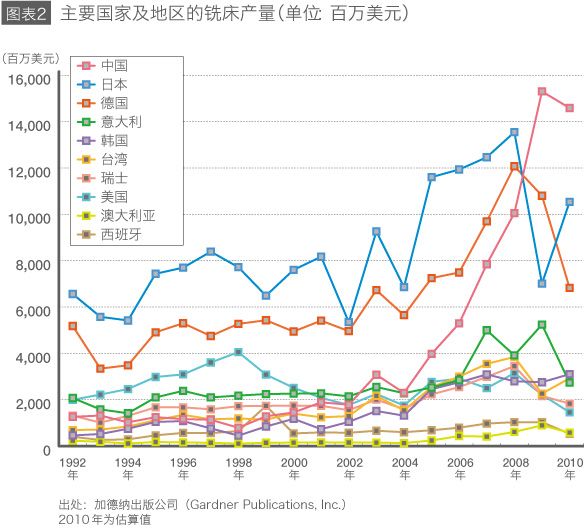 图表2显示的是主要国家及地区铣床产量的变化(根据美国加德纳出版公司的统计)。2010年的总产值(28个国家)为482亿3340万美元。其中首位是中国(145亿8540万美元,30.2%),日本位居第二位(105亿3900万美元,22%),第三是德国(68亿2500万美元,14.2%)。近年,一直是这三个国家三足鼎立竞相角逐的局面。回顾过去,凭借汽车的大量生产,日本国力大增,在1982年超过了曾引领世界的美国跃居第一,之后,至2009年的27年里,一直独占鳌头。