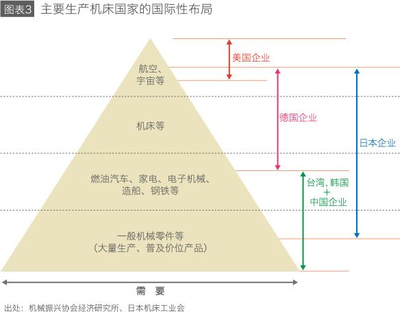 图1所示的是机床主要生产国家的世界布局(根据机械振兴协会经济研究所的资料,并添加了日本机床工业会的修订以及个人见解)。日本的机床产业用户分布领域广阔,遍及宇宙航空业到一般零件生产行业,但主要还是依存于生产2-3万种零部件的汽车零件产业,约占订货总额的60%。在日本,生产成品车的企业有丰田、日产、铃木、本田等12家,年产量962万6000辆(2010年的数据,上一年同期比121.3%)。另外,向成品车企业提供零部件的厂家(Tier1、Tier2),有442家(Denso、Aisin精机、NTN、KYB等)加盟日本汽车零件工业会,还有未加盟的Tier3、Tier4企业……,这一产业覆盖面广并形成金字塔构造。汽车产业的设备投资额(2008年度计划额)为1兆6209亿日元,相当于整个制造业(7兆5210亿日元)的21.6%。机床的设备投资只占其中的微少部分。根据日本机床工业会的订货统计,提供给汽车行业的是893亿7300万日元(2010年),占订货总额的9.1%。从表面上看,并不存在“大约60%的依存度”,但由于来自一般机械、电气、精密机械企业的订货,其最终用户包括了汽车产业的零件与装置,所以有“大约60%的依存度”的说法,因此也就形成了如果受到汽车产业不景气的影响,日本的制造业便会出现停滞的结构。正是这里,既培育了日本机床产业的优势,又呈现出它脆弱的一面。在汽车产业走出日本,扩大海外生产规模的情况下,如果所在国政府在“扶植汽车产业”的方针下采取优先使用本国零件和机床设备的政策,将日本产品拒之门外,那么日本的机床厂家马上就会奄奄一息了。