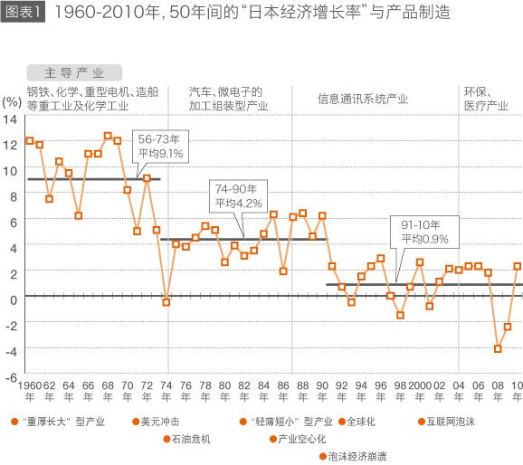 如上所述,机床产业的发展与经济增长率密切相关,在此让我们来看看战后日本的GDP与主导产业的变迁状况(图表1)。在1956年-1973年的经济高速增长期(平均经济增长率为9.1%),大战结束已有10年,重建复兴所必需的钢铁、化学、电气设备、造船等重工业及化学工业(“重厚长大”型产业)崛起并牵引了日本经济的发展;1974年-1990年(平均经济增长率为4.2%),重点开始转向汽车、微电子的加工组装型产业(“轻薄短小”型产业),成为世界经济发展的动力;而后,经济发展趋向稳定,市场呈现饱和,日本的主导产业又转入了环保与医疗领域。与此同时,“金砖四国”(巴西、俄罗斯、印度、中国)也在重工业与化学工业的基础之上,创建起了加工组装型产业。