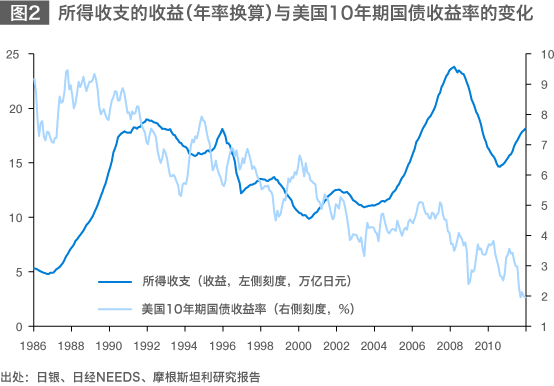 尽管过去20多年来,美国长期利率呈持续下降趋势,但令人甚至感到有些意外的是,日本的所得收支的收益却未受到其影响(图2)。此中理由主要有以下两点。