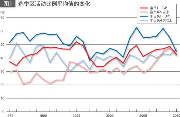 在表示全国性得票率变动情况的摆幅(swing)不断扩大的背景下,议员开始稍稍增多了选举区活动。甚至是那些拥有大型后援会的议员也增加了深入选举区的活动量,以便提早做好选举准备。图-1以年为单位,展示了选举区活动比例平均值的变化。(*1)比如,1985年自民党议员(当选1-3次)的选举区活动比例平均为37%。这表示自民党议员每个月有三分之一的时间在选举区。