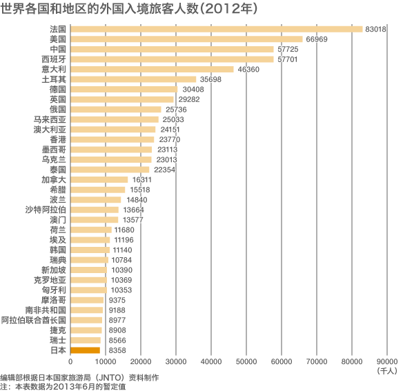 但是,从世界范围来看,在访日外国旅客人数上,日本离“观光大国”还有相当差距。联合国世界旅游组织统计的“世界观光排名榜”(2012年)显示,世界首屈一指的观光大国法国的外国旅客人数为8301万人,独占鳌头;排列第二的是美国,为6696万人;第三是中国,为5772万人;第四是西班牙,为5770万人;第五是意大利,为4636万人……。日本2012年为836万人,排在第33名,大约只有法国的十分之一。