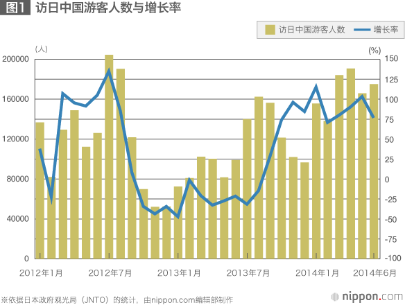 据日本政府观光局(JNTO)统计,由于受日本政府2012年9月11日尖阁诸岛国有化(中国名:钓鱼岛)及由此引发的激烈的反日示威的影响,访日中国人的数量遽降。同年10月仅为69713人次,环比减少近半(9月为121672人次),同比也减少了34.3%。之后的11个月里,访日人数持续呈现负增长。在尖阁诸岛国有化风波过去1年之后,中国人的反日情绪渐趋平静,从去年9月开始,中国人的日本游终于峰回路转,游客人数同比增长28.4%。今年1~6月游客人数已达1009200人次,同比增长了88.2%。