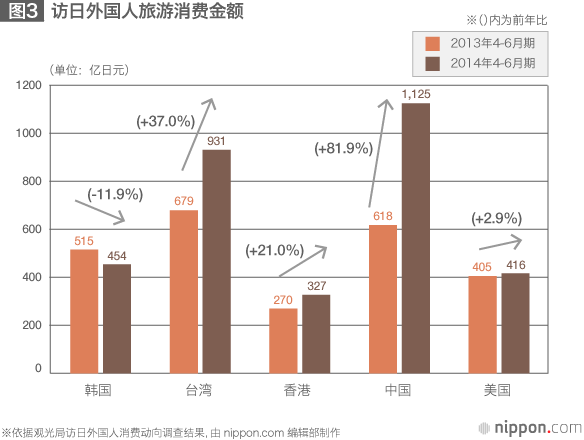 中国游客花钱的派头也压倒了其他国家和地区。国土交通省观光厅的抽样调查(调查对象6600人)显示,今年第2季度,访日外国游客人均旅游支出为143942日元,而中国人则达到211784日元(大约12600元),可见中国人购买力之旺盛。同期访日中国人的数量为531258人次,同比增长89.2%。统计结果表明,各国家和地区游客旅游消费总额,中国居首,为1125亿日元(占全部的23.1%),第2位以下依次是台湾931亿日元(占19.1%)、韩国454亿日元(占9.3%)、美国416亿日元(占8.5%)、香港327亿日元(占6.7%)。