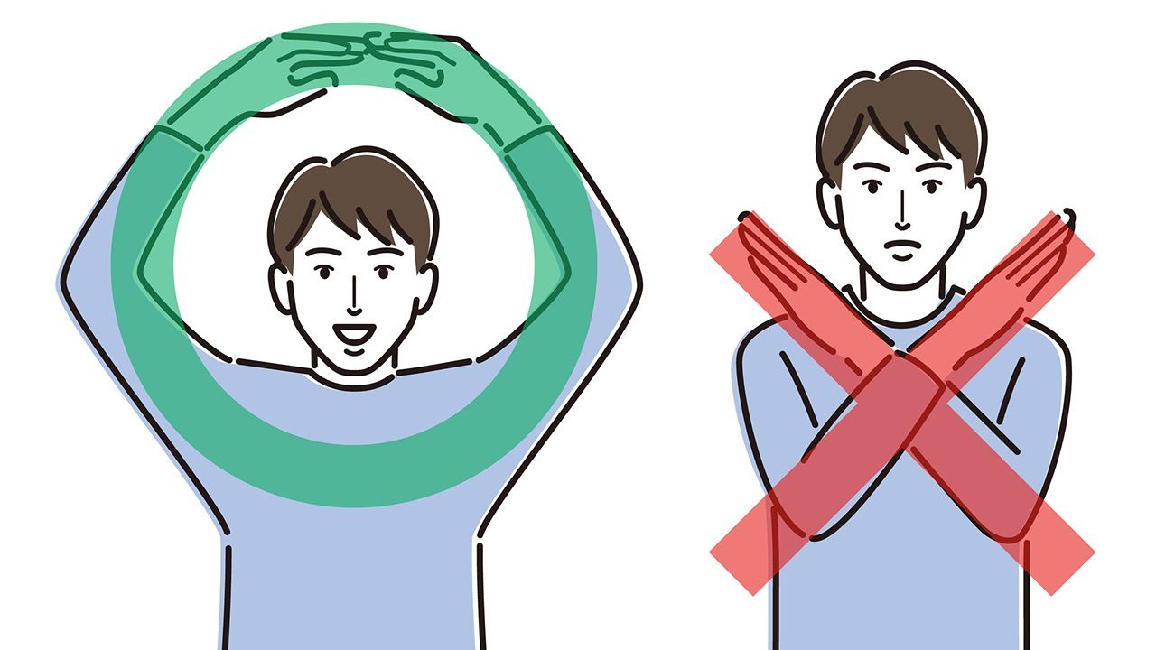 圆圈与叉号还作为一种手势而被广泛使用,甚至衍生出对应的表情符号:双手在头顶合拢形成一个圆圈(🙆),表示同意或认可;而将双臂交叉于胸前形成一个叉号(🙅),则表示反对或拒绝。