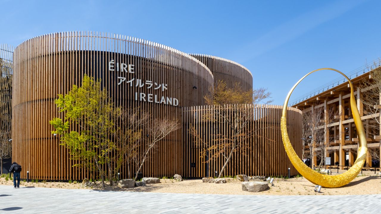 展馆建筑的核心元素,源自古代凯尔特纹样“三曲腿图”,象征着三位一体。从上往下看,呈现出三圆嵌合般的设计。由三个展馆构成的展览各自拥有自己的主题,它们分别是“爱尔兰”“对日关系”“创造性合作精神”。