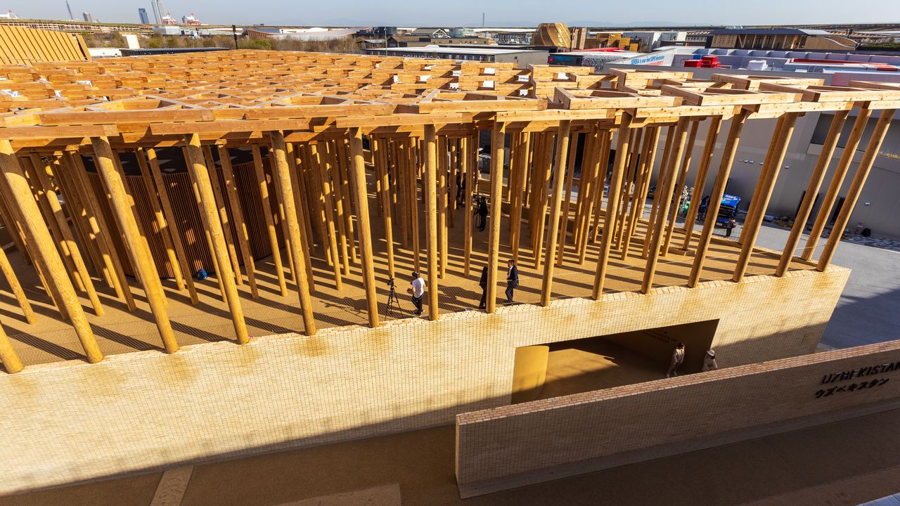 从上方俯瞰,这座两层建筑呈三角形,面积约750平方米。依据传统建筑技术,建筑的基础部分采用了粘土和砖块,屋顶则由约280根木材和可重复使用的天然材料建成。木材是在大阪附近采伐的杉木,世博会结束后,计划将它们运往乌兹别克斯坦,重新利用于教育设施等建筑中。这既表明了乌兹别克斯坦为实现循环经济而进行的努力,也是该国与日本友好关系的象征。