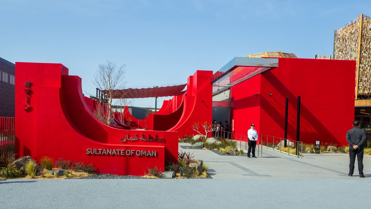 展馆以“大地、水和人类”为主题,表现了阿拉伯海、沙漠、山脉和绿植等阿曼千姿百态的自然风貌。展馆户外空间排放着大大小小的红色装置艺术作品,为游客提供了一个可以坐下来休息交流的场所。通往室内展厅的是一条走廊,水在其玻璃天花板上流淌。