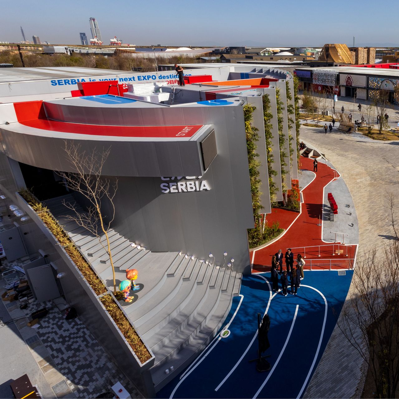 展馆的设计灵感源自面向首都贝尔格莱德市中心的一座浮现在多瑙河上的小岛。以建筑表现了与自然和谐共存的美丽城市景观。