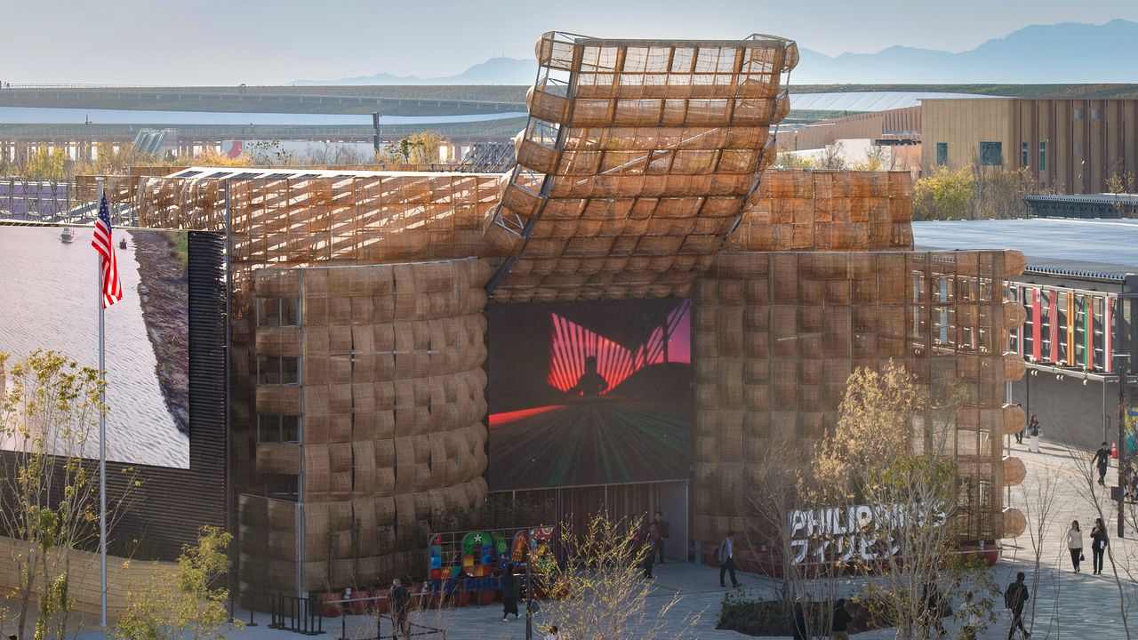 展馆的主题是“自然、文化、共同体,交织出更美好的未来”。建筑物的外观设计模仿了传统藤编工艺,侧面壁板展示了212块传统手工艺编织挂毯,以此表现由7000多个岛屿构成的该国各民族的多样性以及人与人之间的精神纽带。