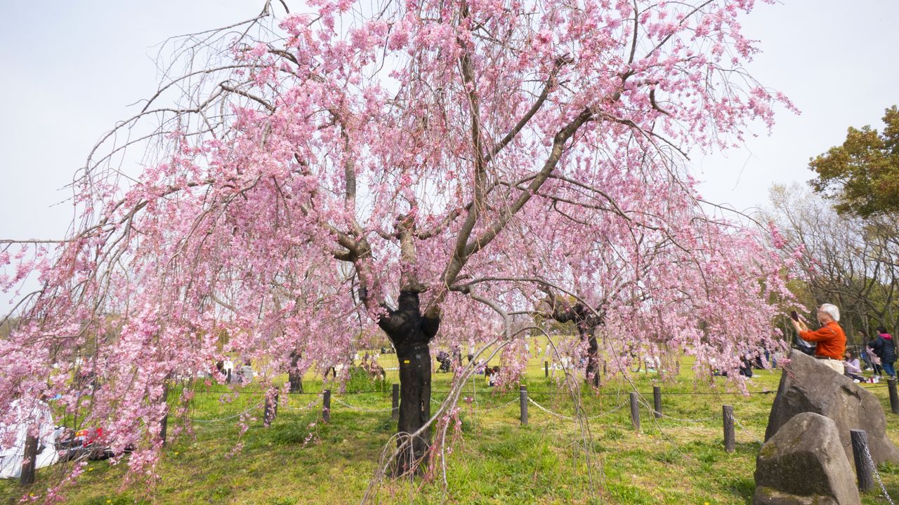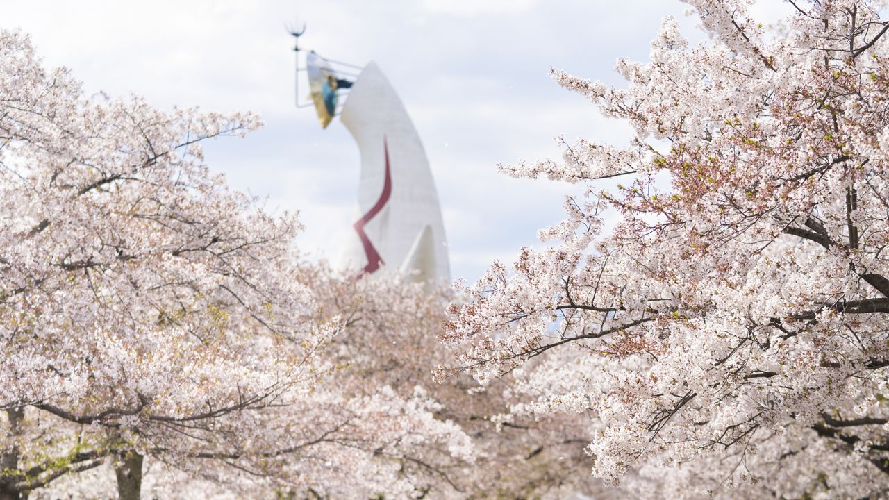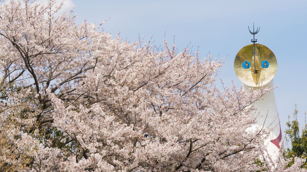 在1970年的大阪世博会会场旧址上建成的世博纪念公园,场地开阔,种有以染井吉野为主的9个品种共计多达5000棵樱树,随处都是赏樱景点。其中最不可错过的,当属艺术家冈本太郎创作的大阪世博会标志“太阳塔”和樱花的同框出镜。太阳塔高达70米,在淡粉色的樱花之上悄然露出金色面孔的构图,总会让人情不自禁地按下快门。最佳观赏期是每年3月下旬至4月上旬,里樱等品种则可以持续到4月中旬。