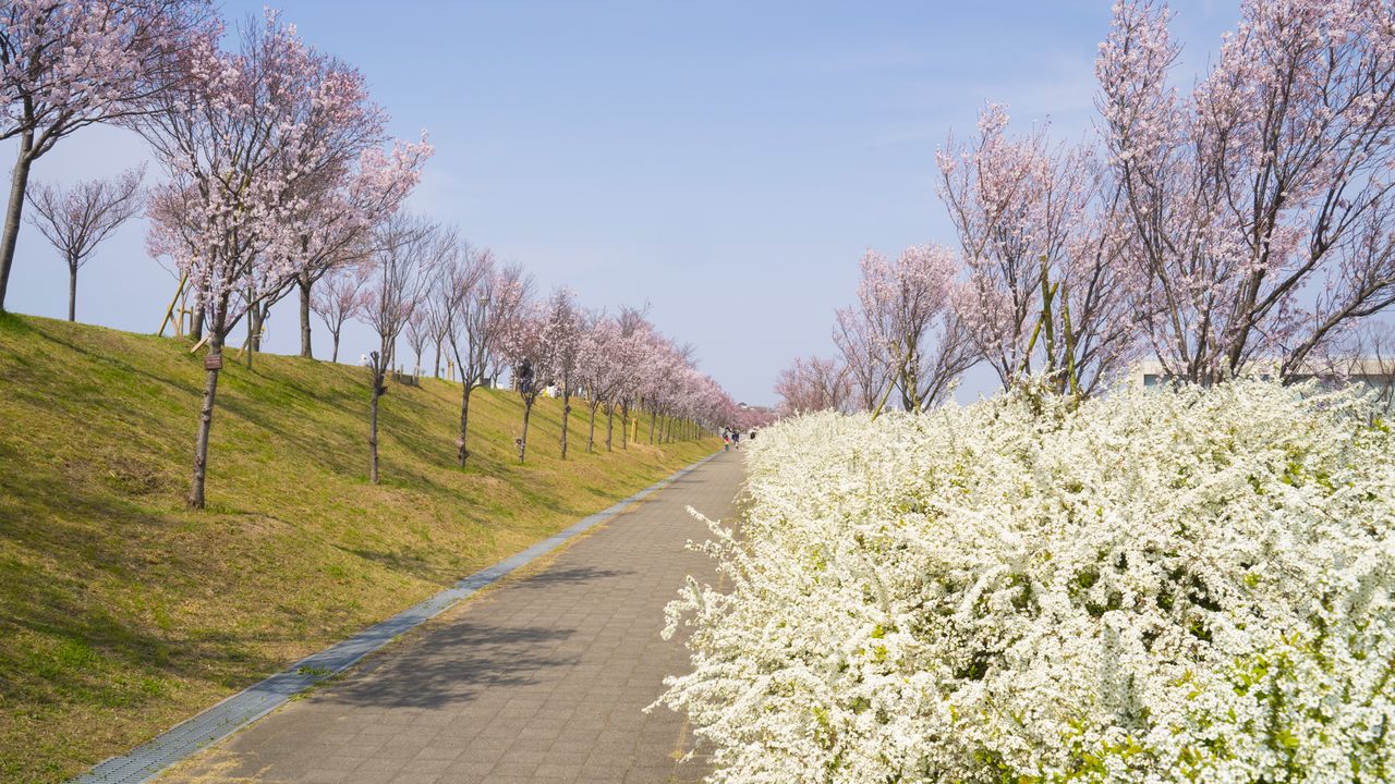 狭山池公园(狭山市)是大阪地区可以较早赏樱的一处名胜。池塘周围的小道边种植了大约1000棵日本早樱越之彼岸樱,和缀满小白花的雪柳竞相绽放。3月下旬至4月中旬期间,散步于水边,周围是由樱花的淡粉、雪柳的洁白、草坪的葱绿构成的柔美色调,令人倍感精神舒畅愉悦。