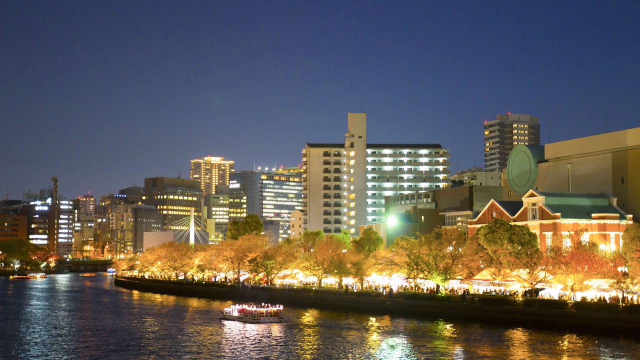 自1883年至今,“造币局樱花通道”(大阪市北区)已有超过百年的历史,是深受大阪人喜爱的春季一景。每年到了樱花观赏期,造币局院内旧淀川沿岸长约560米的道路面向公众限时开放一周。由于这里的主要樱花品种是开花较晚的八重樱,观赏期晚于染井吉野,因而作为樱花季的收官之地,每年都吸引着大量赏花客的到来。因为一直开放到晚上9点,日落后还能观赏到在灯笼的柔光映衬下更显妩媚动人的夜樱。虽然是限时开放,但也被选入“樱百选”之中。