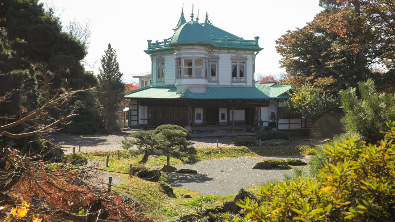伫立在盛美园一角的盛美馆,是专为眺望庭园而兴建的。建筑物一层是纯日式风格,二层是西式风格,日西结合,具有与庭园浑然一体的独特美感,让人联想起鹿鸣馆时代的风貌。