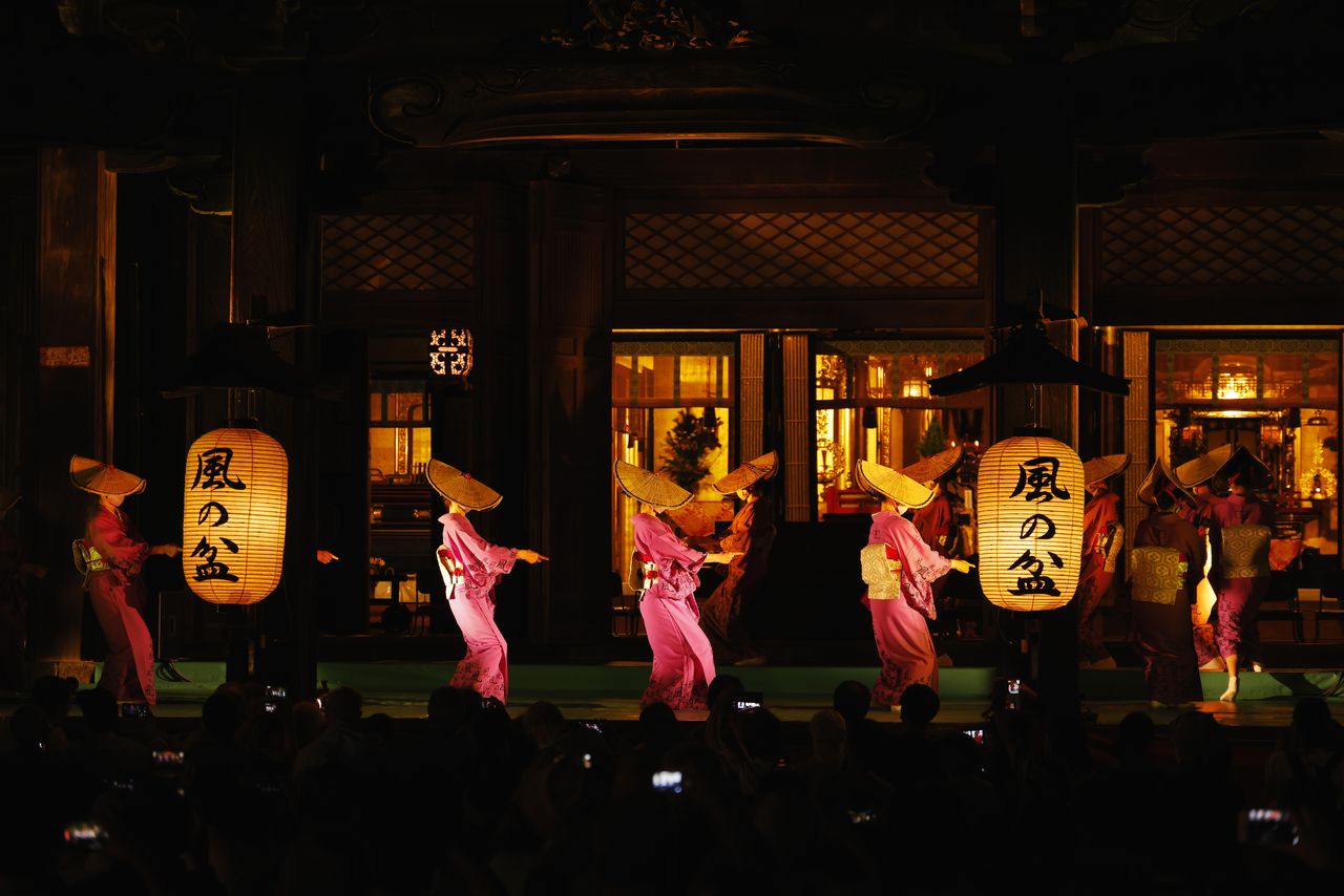虽叫风之盂兰盆节,但它却不是盂兰盆节期间的活动。这里将换季时节称为“盆”。尤其是立春之后的第210天,大概是9月初,被称作“二百十日”。这时风力大台风多,当地人希望待收割的水稻不遭灾害,有个好收成,所以三百年来一直用舞蹈来祈祷。
