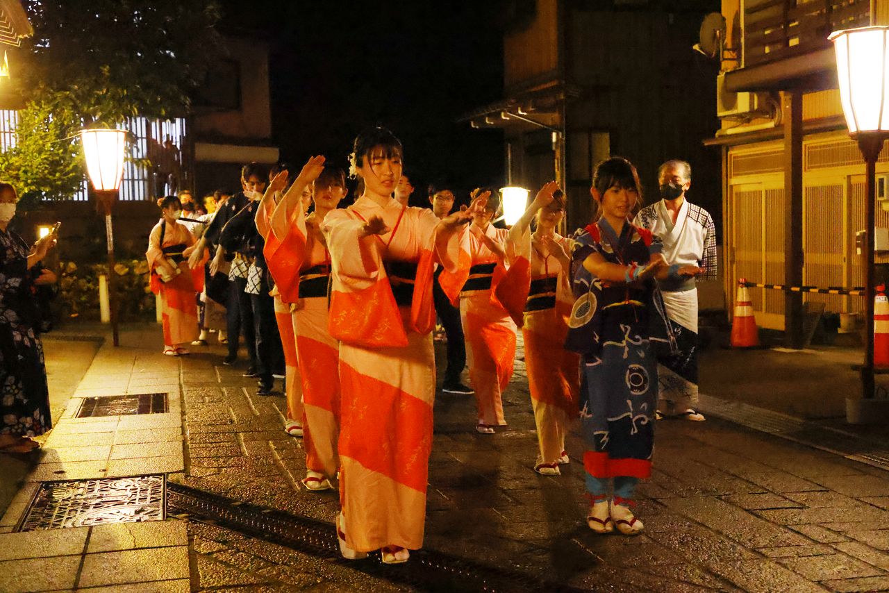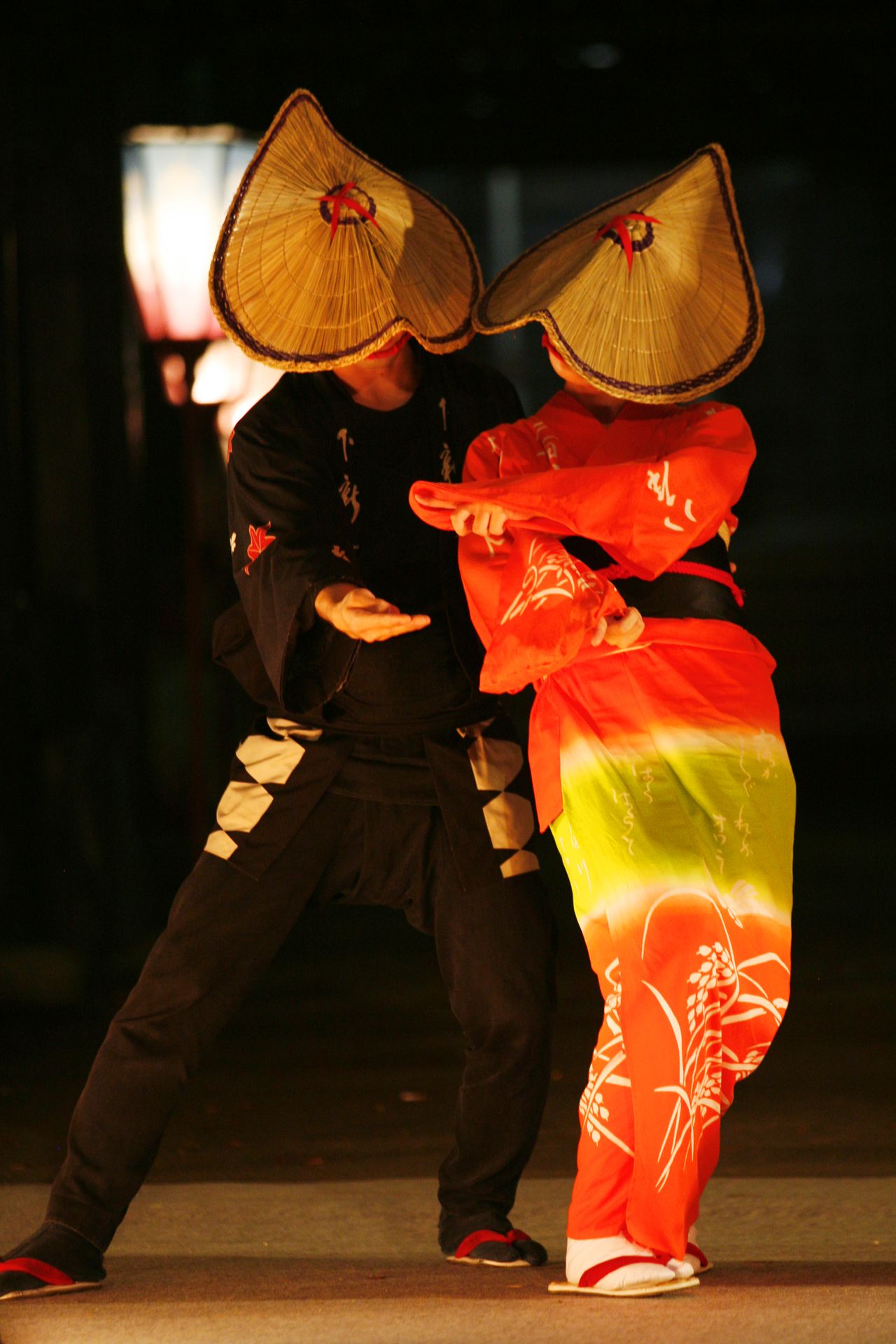 夕阳西下,游客不断增多,耳边传来日本传统乐器三味线的声音。各条街上,数十位身穿夏日和服的男女舞者边走边跳,女舞优雅,男舞豪放。街角广场上,男女双人舞表演,充满激情,夺人眼目。