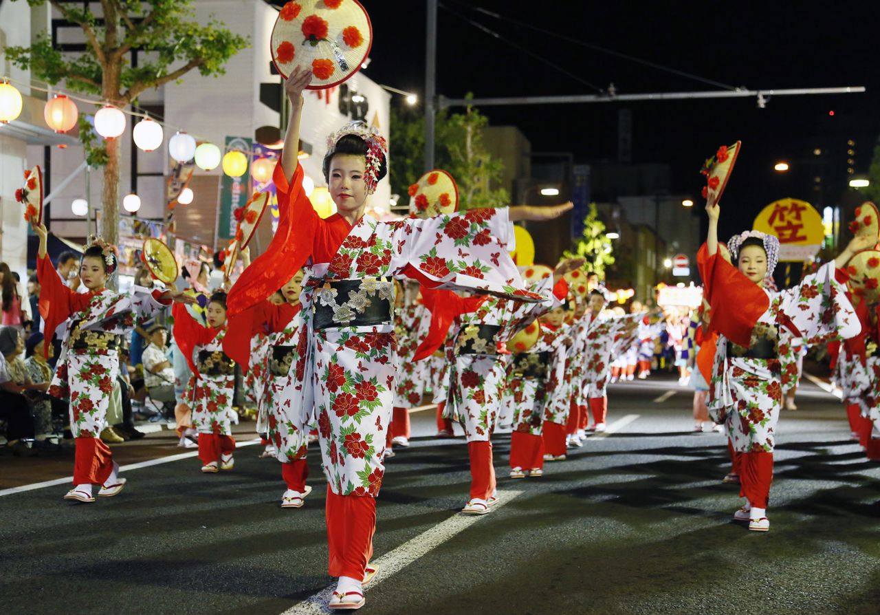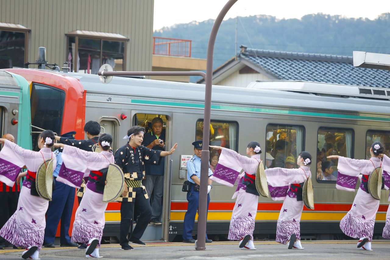 在各个街道,舞者们选择合适的时间进行表演,活动一直持续到凌晨。等游客登上返程的首班列车,福岛地区的舞者还会在站台跳舞送别。