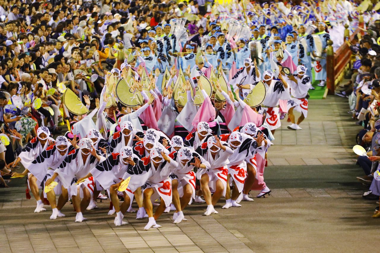 阿波舞起源于1586年,当时为庆祝德岛城竣工,人们不拘虚礼,尽情欢跳了三天。该舞后与祭祀祖先的盂兰盆舞相结合,演变为边走边舞的行进式舞蹈表演活动,现如今它以日本最富活力的一大赛会活动而为人熟知。