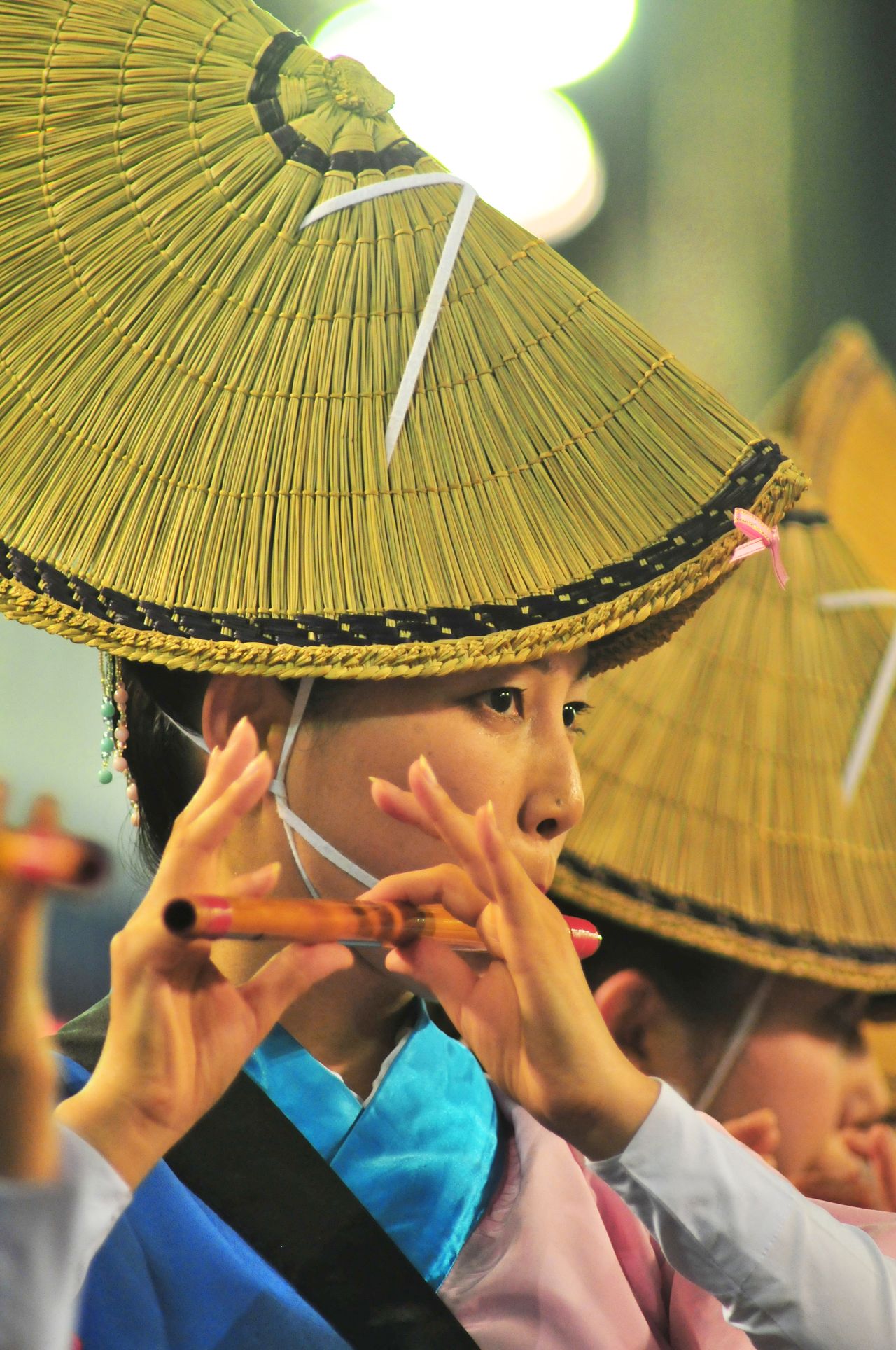 演出开始,在一阵热闹的乐器演奏后,头戴斗笠的女性舞者伴着传统民谣登场。民谣歌词颇有喜感——“跳舞的傻瓜,看戏的傻瓜,既然都是傻瓜,那就一起来跳舞傻乐吧”。优美的手舞加上色彩艳丽的夏日和服,格外光彩夺目。接下来是男舞者们屈膝矮身,豪放起舞。无论男女,脸上都露出明媚的笑容,令人印象深刻。