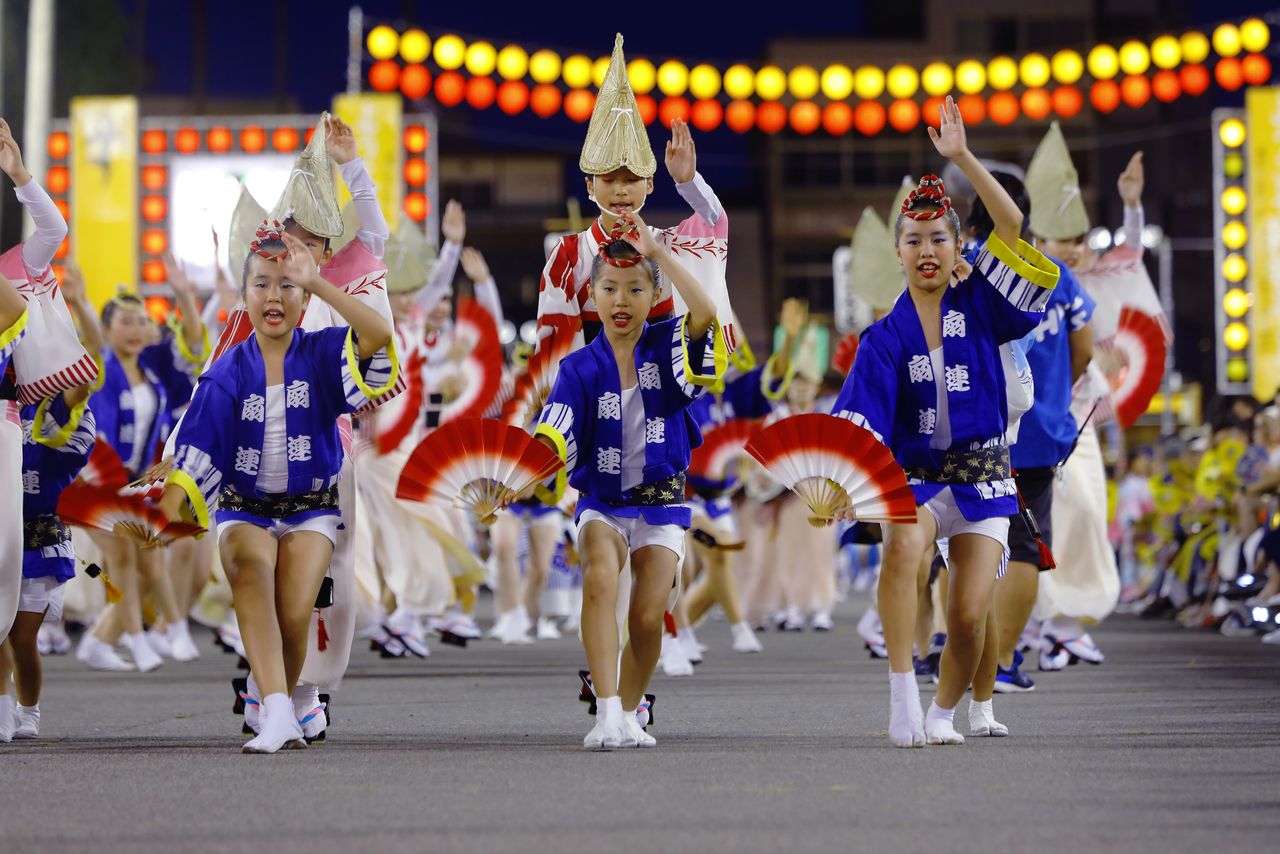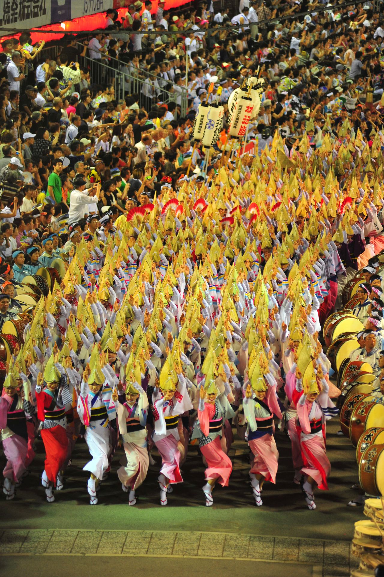 乘坐日本铁路公司(JR)的列车在德岛站下车后,三味线的声音传入耳中,令人顿时充满了对阿波舞盛典的期待。前来参观的游客有100万人,相当于德岛市人口的四倍。市区特别设置了长100米到120米的跳舞场地,以及可容纳大量观众的收费和免费表演场地共4处,路上也随处可见会场。活动持续4天,期间整个城市都洋溢着节庆气氛。