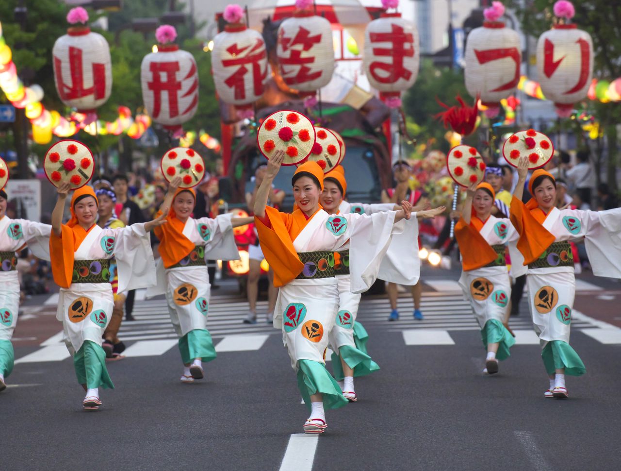 山形花笠节为期3天,约160个花笠舞舞蹈团齐聚一堂,展露身手。“传统花笠舞保存会”率领1.4万名舞者,在长达1.2公里的繁华街道边走边舞。盛装巡游从傍晚开始,持续3个多小时。