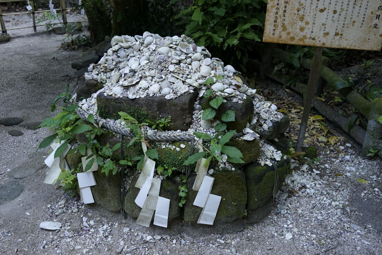覆盖海滩的不是沙粒,而是小海螺和双壳贝的贝壳。这座岛屿最早形成于海底,由贝壳堆积而成。这里自古人们称宝贝科贝壳为“真砂”,所以青岛又名“真砂岛”。相传在神社前的海滩捡“真砂”供奉到元宫(曾经的正殿),愿望即可成真。