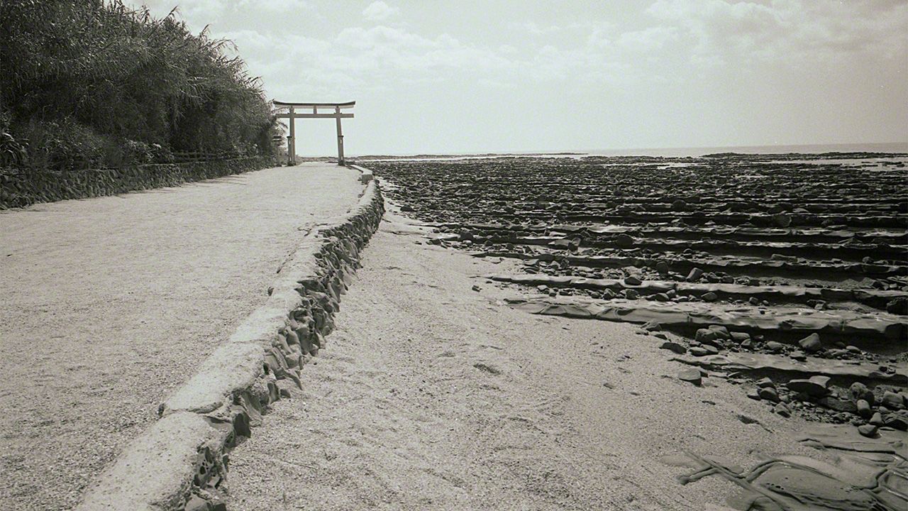 标题图片:青岛神社的鸟居矗立在密布“魔鬼的洗衣板”的海滩(大坂宽)